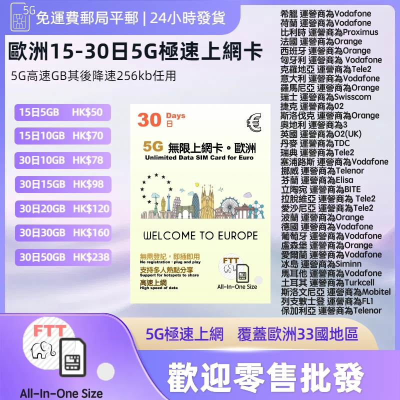 歐洲15日上網卡 5-10GB高速其後(256kb)無限上網 15日 歐洲 5GB之後限速無限 HK$ 50 15日 歐洲 10GB之後限速無限 HK$ 70 歐洲30日上網卡 10-50GB高速其後(256kb)無限上網 30日 歐洲 10GB之後限速無限 HK$ 78 30日 歐洲 15GB之後限速無限 HK$ 98 30日 歐洲 20GB之後限速無限 HK$ 120 30日 歐洲 30GB之後限速無限 HK$ 160 30日 歐洲 50GB之後限速無限 HK$ 238 --覆蓋範圍:希臘、荷蘭、比利時、法國、西班牙、匈牙利、克羅地亞、意大利、羅馬尼亞、瑞士、捷克、斯洛伐克、奧地利、英國、丹麥、瑞典、塞浦路斯、挪威、芬蘭、立陶宛、拉脫維亞、愛沙尼亞、波蘭、德國、葡萄牙、盧森堡、愛爾蘭、冰島、馬耳他、土耳其、斯洛文尼亞、列支敦士登、保加利亞 *即插即用免登記 *所有4G/5G手機通用 *支持網路分享(Data sharing) *每日香港23:59前為1日 *提供免費24小時whatsapp技術支援 *Nano、Micro、Normal SIM三合一(適合各款手機)