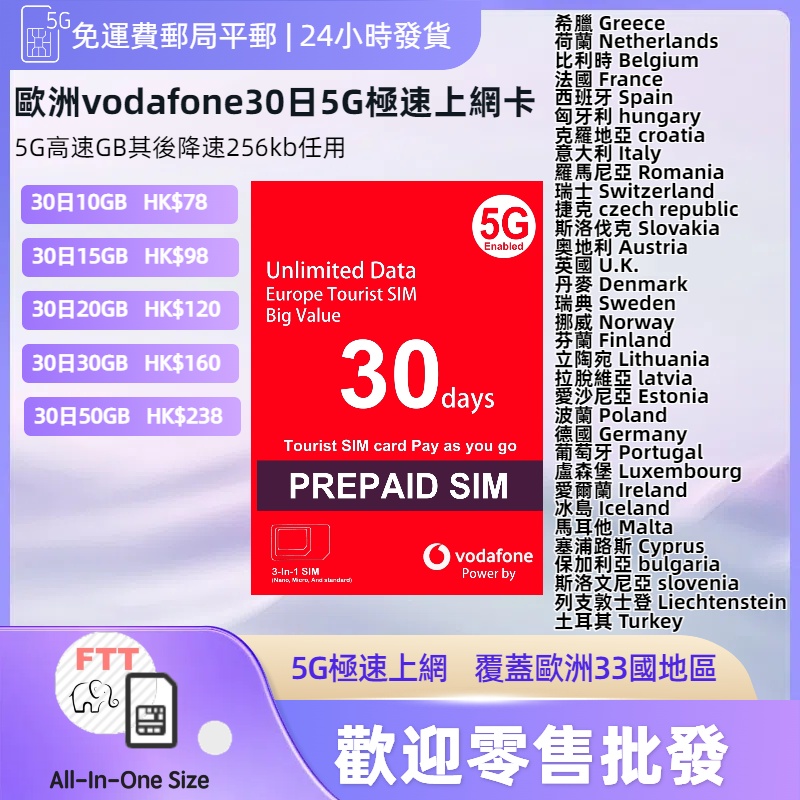 vodafone歐洲30日5G極速上網 土耳其數據卡 荷蘭上網卡